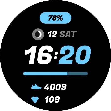 Vision 是一款簡單而多彩的數位錶盤穿戴式作業系統。錶盤中央放置了根據您的智慧型手機提供的 12 小時和 24 小時制數位時間。點擊分鐘,您可以打開可自訂的快捷方式,而鬧鐘將隨小時打開。在上部,點擊將帶您進入日曆,而在下部,它將測量即時心率。時間下方有一個進度條,顯示當天從午夜到午夜的進度。在設定中,可以從八種可用顏色中進行選擇來更改基色。底部有步數和心率值。始終顯示模式反映了標準模式。