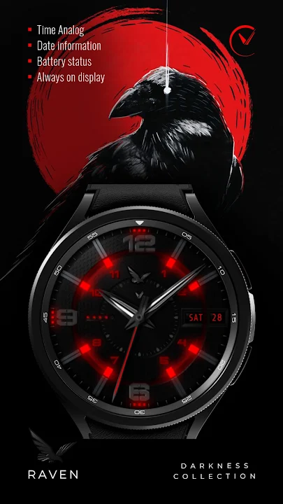 Classic analog watch face "RAVEN" in dark colors. Not only save battery power, but also give a mystical style to your smart watch. You can choose different bright colors of the elements of the classic watch face and customize the background. The ability to add custom additions will make the watch face not only beautiful but also more functional.