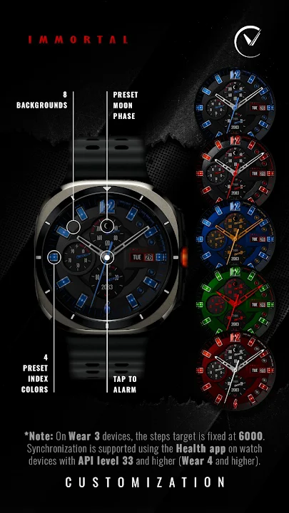 “Immortal”表盘采用时尚简约的设计,具有永恒的魅力。其精致的界面一目了然地显示时间、日期和基本健身指标,确保您无论在何种场合都能保持连接和时尚。