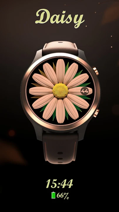 這款簡約的錶盤優雅地顯示時間和電池狀態。分鐘圍繞著十二片花瓣組成的雛菊花旋轉,每片花瓣代表一小時。電池電量由花朵後方低調的葉子指示。