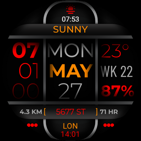 带天气信息和多色主题的 Wear OS 智能手表的数字表盘。