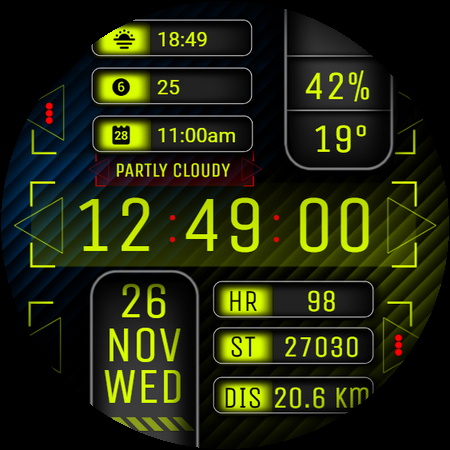 智慧手錶的數位錶盤包含天氣資訊和多色主題