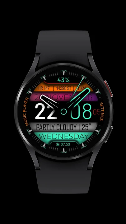 智能手表的模拟表盘包含天气信息和多色主题