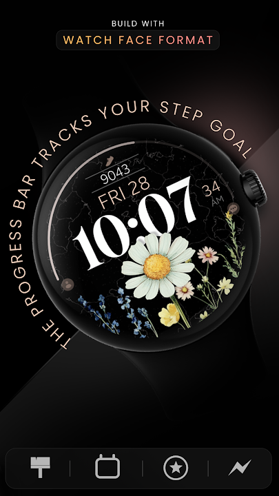 這款專為 Wear OS 打造的時尚數位錶盤將雛菊圖案與實用的步數追蹤功能完美結合。雛菊會隨著你接近每日步數目標而綻放,並配有清晰的進度條,激勵你不斷前進。