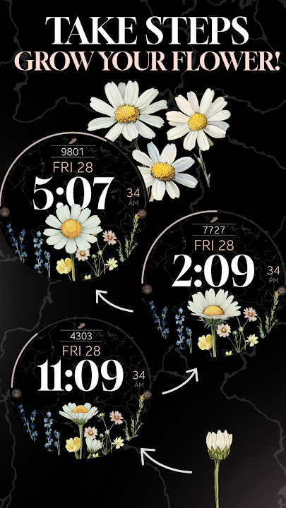 適用於 Wear OS 的野花數位錶盤:雛菊隨著您每天的腳步而成長。