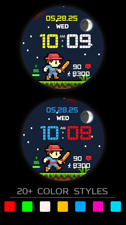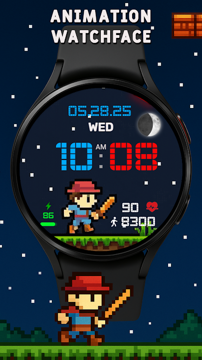 WIN RetroGame Pixel - animated watch face for Wear OS for retro game fans! Feel like a hero of a pixel quest right on your wrist: steps, heart rate and charge are displayed as in a real game, and the hero comes to life thanks to smooth animation.
