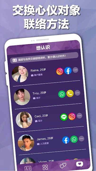 WeDate App是一款结合了AI优势且功能独特的交友社交App,与其他交友App不同之处,除了WeDate提供强大的AI智能配对功能外,它更可以直接与其他用户交换联系方式,包括FACEBOOK、INSTAGRAM和LINE等。