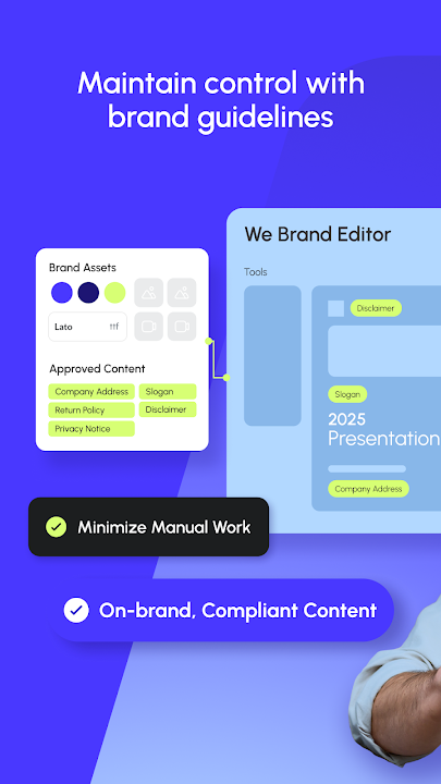 无需聘请设计师或委任专业机构, 您可以自行更新您的行销材料,包括更新图片、价格、 地址、 姓名、 日期、 用户行为号召或任何其他的需要。We Brand 让机构组织里的所有人可以访问、 编辑和分发内容,同时确保品牌设计保持一致。