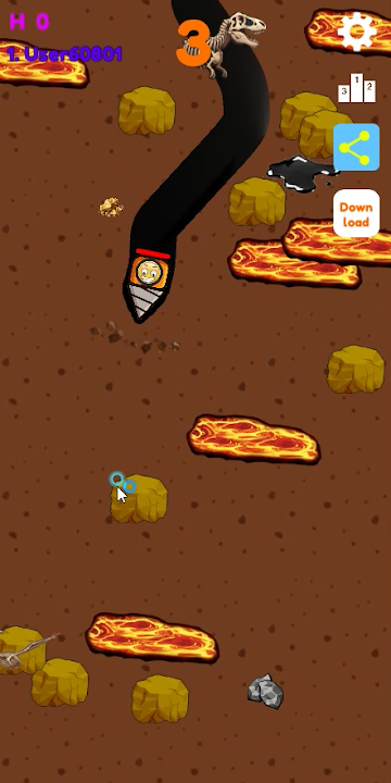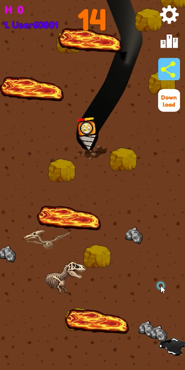 地下有各种各样的障碍。黄金、铁矿石和石油可以强化你的钻头。岩石和熔岩会损坏你的钻头。尽可能深挖,避开岩石和熔岩。
