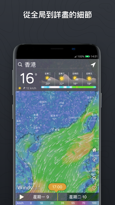 無論您是要追踪熱帶風暴還是潛在的惡劣天氣,計劃旅行,追求您最喜歡的戶外運動,或者您只需要知道這個週末是否會下雨,Windy為您提供最新的天氣預報。