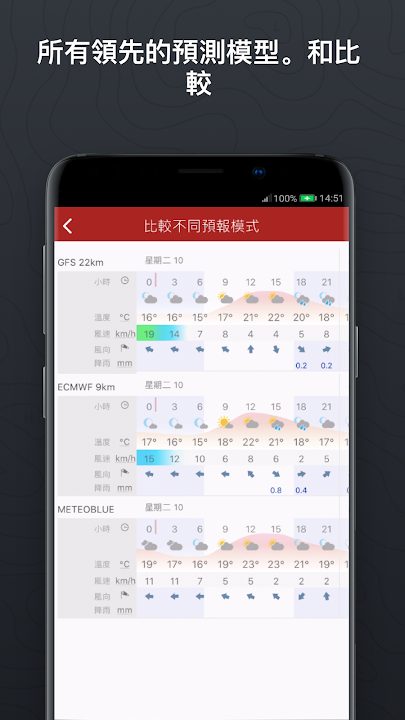強大,流暢,流暢的展現方式使天氣預報成為真正的樂趣!一次提供所有的預測模型