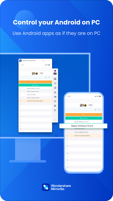 MirrorGo casts Android phone screen to your PC in 1 click. You can also control your Android using mouse and input from PC keyboard.