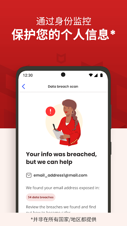 移动安全功能可同时保护多达 5 台设备,支持智能手机、平板电脑、PC 和 Mac。此外,我们还提供防病毒清理工具和业界领先的保护分数,保护您的重要信息,让您舒心畅享线上生活。您可以采取建议措施加强自身隐私安全,例如扫描公共 Wi-Fi 网络、解决数据泄露问题或启用防病毒保护。