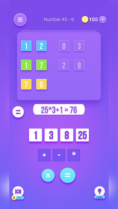 1 - 滑動模式:只需連接數字和數學函數即可形成正確的方程式,以實現顯示的目標數字。