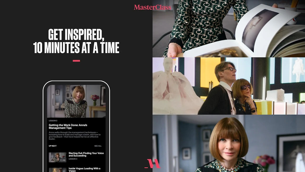 Aaron Franklin, Aaron Sorkin, Alice Waters, Anna Wintour, Annie Leibovitz, Armin van Buuren, Billy Collins, Bob Iger, Bob Woodward, Bobbi Brown, Brandon McMillan, Carlos Santana, Chris Hadfield, Chris Voss, Christina Aguilera, Dan Brown, Daniel Negreanu, Danny Elfman, David Axelrod & Karl Rove, David Baldacci, David Lynch, David Mamet, David Sedaris, deadmau5, Diane von Furstenberg, Dominique Ansel, Doris Kearns Goodwin, Frank Gehry, Gabriela Cámara, Garry Kasparov, Goodby & Silverstein, Gordon Ramsay, Hans Zimmer, Helen Mirren, Herbie Hancock, Howard Schultz, Itzhak Perlman, Jake Shimabukuro, James Patterson, James Suckling, Jane Goodall, Jimmy Chin, Jodie Foster, Joyce Carol Oates, Judd Apatow, Judy Blume, Kelly Wearstler, Ken Burns, Malcolm Gladwell, Marc Jacobs, Margaret Atwood, Martin Scorsese, Massimo Bottura, Mira Nair, Misty Copeland, Natalie Portman, Neil deGrasse Tyson, Paul Krugman, Phil Ivey, R.L. Stine, Reba McEntire, Robin Roberts, Ron Finley, Ron Howard, RuPaul, Ryan Chetiyawardana & Lynnette Marrero, Samuel L. Jackson, Sara Blakely, Serena Williams, Sheila E., Shonda Rhimes, Simone Biles, Spike Lee, Stephen Curry, Steve Martin, Tan France, Thomas Keller, Timbaland, Tom Morello, Tony Hawk, Usher, Werner Herzog, Will Wright, Wolfgang Puck, and more added regularly.