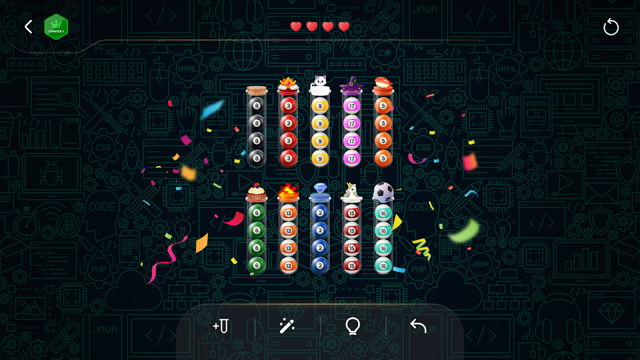 💧Tap on a bottle to pour its balls into another one, but remember, you can only pour some balls of the same color, and each bottle should contain only one color of ball.