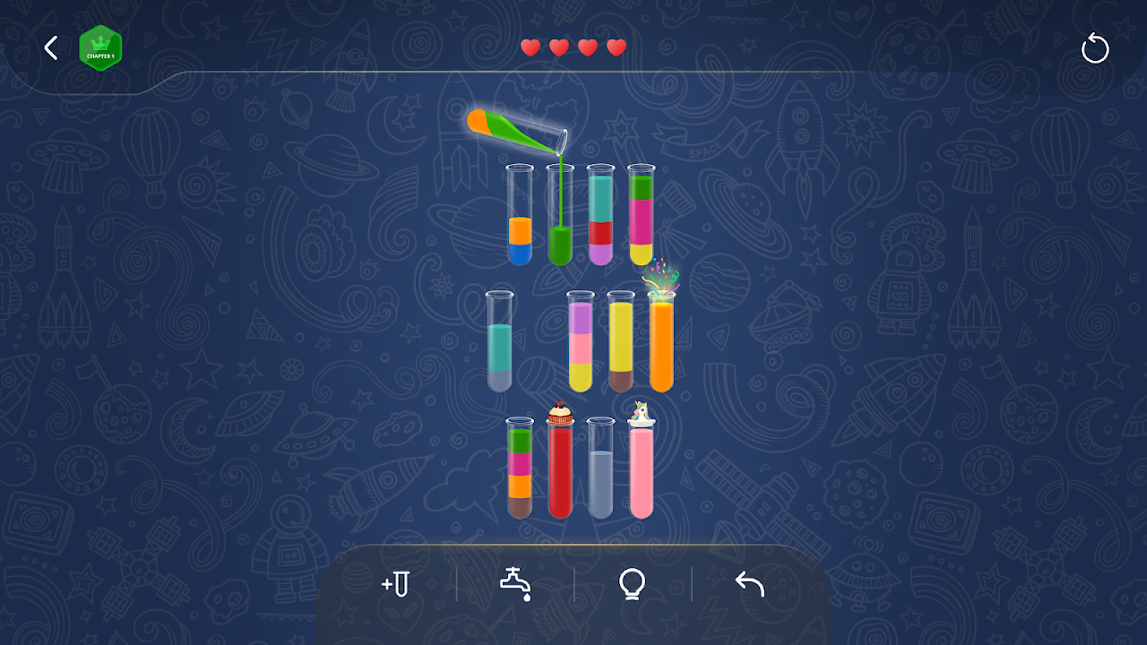 💧點擊一個瓶子即可將其內容物倒入另一個瓶子中,但請記住,您只能倒入相同顏色的水,並且每個瓶子只能包含一種顏色。