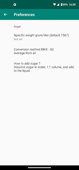 I needed a simple and ad-free app to do those kinds of calculations. In addition calculate the amount of sugar required for brewing wine with a certain Vol % of alcohol. Also important: remember all input values so that I do not need to re-enter them with each app start.