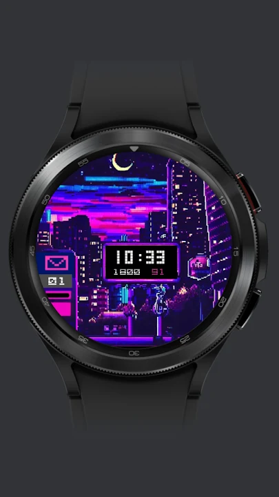 受蒸汽波启发的像素艺术风格表盘特征独特的艺术风格表盘4种不同的颜色风格心跳追踪(10 分钟更新)动画警报通知
