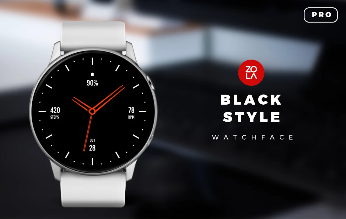 適用於 Wear OS 的 Black Style Pro 錶盤,精美優雅的模擬錶盤,採用簡約設計,專注於易讀性和易用性。
