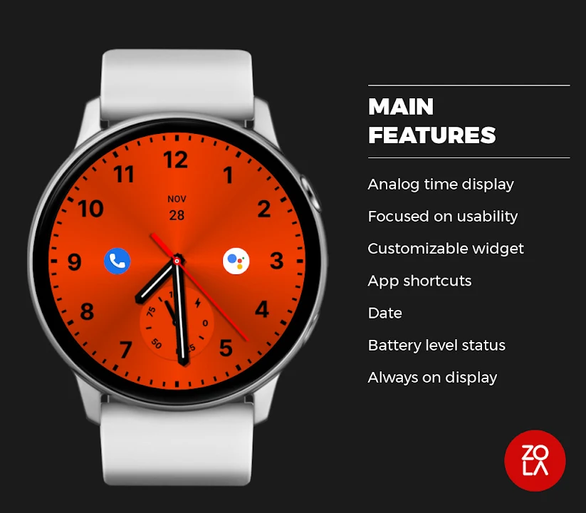 Elegant Red Analog Watch Face for Wear OS, beautiful analog watch face made with an elegant design focused on legibility and usability.