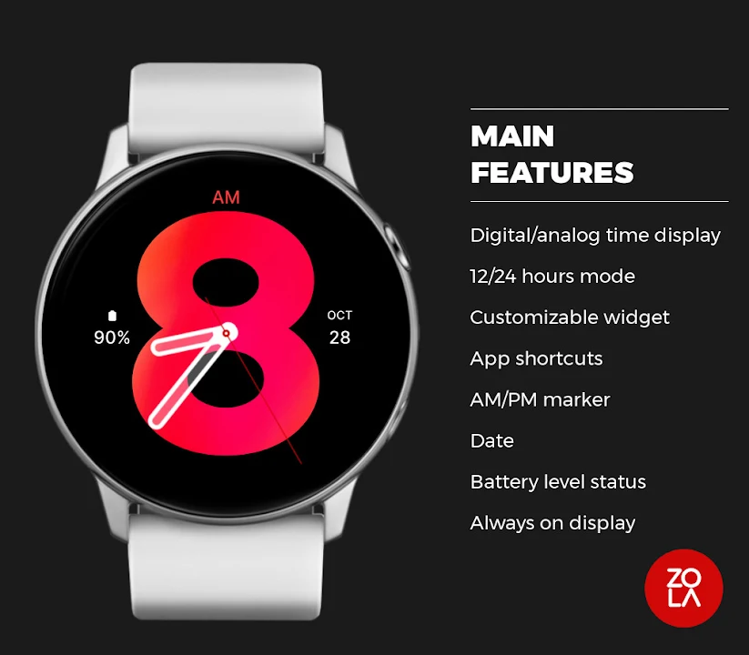 Hybrid Red Watch Face for Wear OS, beautiful hybrid watch face made with stylish design focused on legibility and usability.