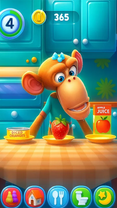照顾你的猴子,喂食、洗澡,确保它得到充足的休息。看着它与周围环境互动、玩游戏,或者只是在舒适的沙发上放松,享受快乐时光。游戏设有浴室,可以给它洗澡;用毛巾擦拭,让它保持干净可爱。在宽敞的卧室里,它可以关灯,尽情放松。