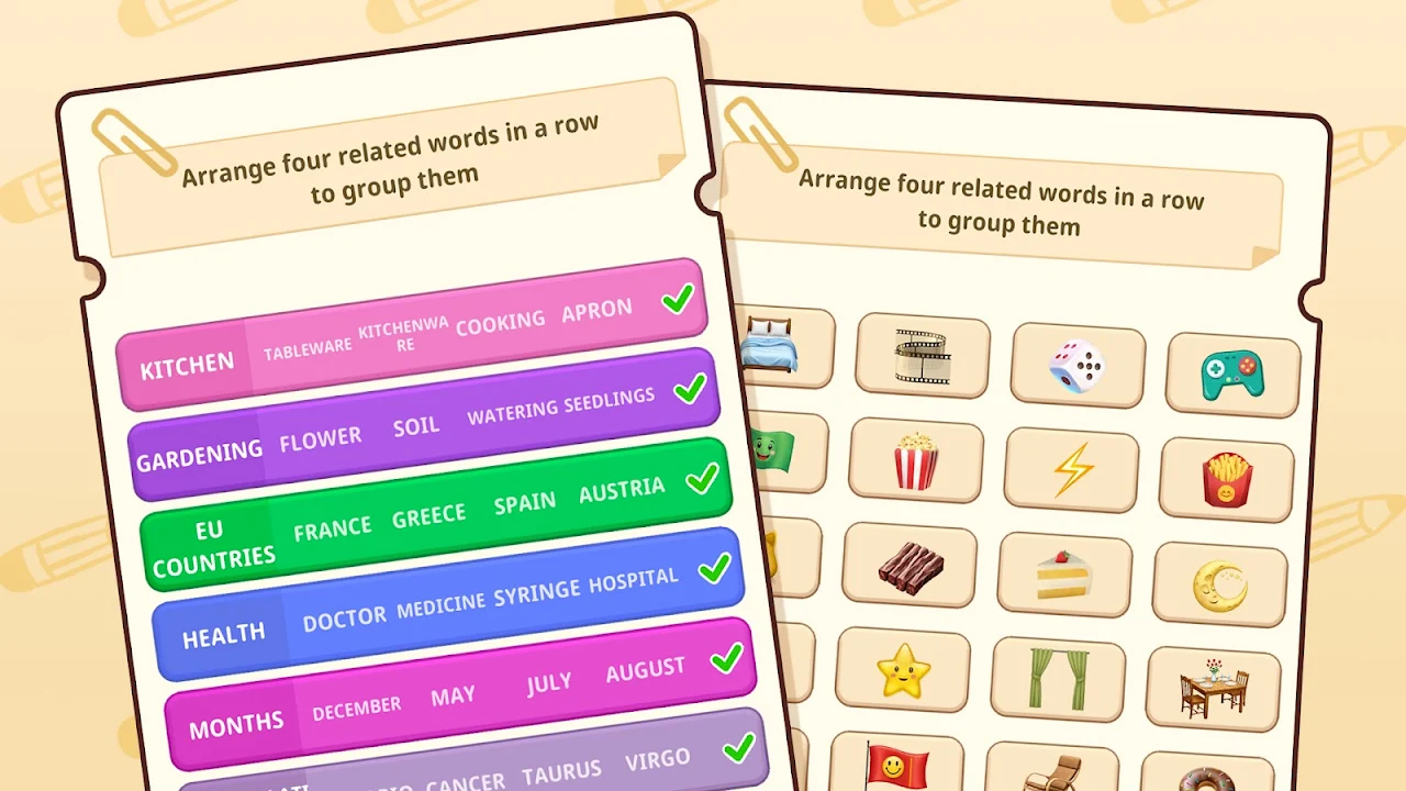 📚 分类挑战:每个关卡都是全新的词语连接游戏挑战,包含一组全新的词语组合。找出词语之间的关联,并进行策略性分组,完成词语匹配分类挑战!这就像在填字游戏中解谜,同时还能获得语言线索!
