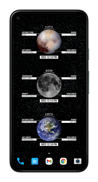 Admire the magnificence of our solar system from your home screen with COSMOS KWGT widget pack. This pack contains many beautiful widgets showcasing picturesque beauty of Sun, planets, moon and dwarf planet of our solar system. Along with beautiful visuals it also pairs fun facts and key details of the celestial bodies to make it educational.