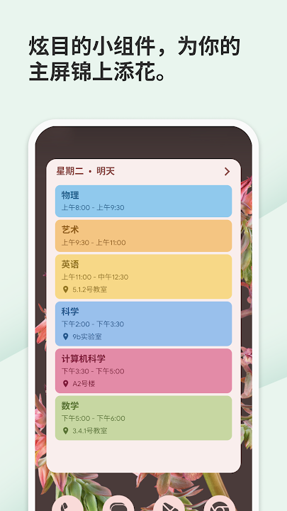 随时查看课程表和每日计划,并根据自己的安排合理规划学习。课程表可高度自定义:您可以为每门课分配不同颜色,还能查看存储在日历中的各类事件。