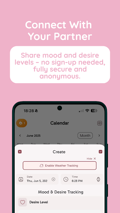 每天記錄您的性慾水平、情緒和身體感受。記錄您是否發生過性行為,無論是獨自一人還是與伴侶,以及您的滿足感。記錄您的自愛時刻、性幻想或任何讓您感覺愉悅的事物。對於女性,我們提供可選的生理週期追蹤器:選擇您的生理期,添加症狀,並了解您的生理週期如何影響您的性慾和情緒。深入了解您的身體。
