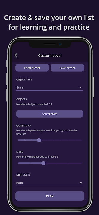 該遊戲旨在教用戶通過多個級別來識別所有 88 個現代星座、最亮的恆星和 110 個梅西耶天體。級別分為類別(星座、恆星和 DSO)、區域(北部、赤道、南部)和難度(簡單、中等、困難)。每個級別只教授少量對象,然後在問答遊戲中訓練知識以幫助記憶。更高級別還復習和重新測試以前學過的對象的知識。