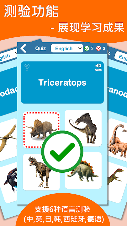 这是一个富含教育性质的互动学习卡,超过 50 张恐龙图片与声音,配合游戏,轻松认识恐龙!