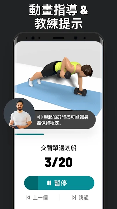 這款應用程式提供數百種健身訓練,涵蓋所有主要肌群,包括肩膀、手臂、胸肌、後背、腹肌、腿肌等等。我們共有 2 個鍛鍊資料庫,分別為 啞鈴 與 體重。您的教練會根據您的目標、健身程度等來選擇訓練項目,為您量身打造 專屬健身計畫。您也可以依自己的需求自訂健身計畫。