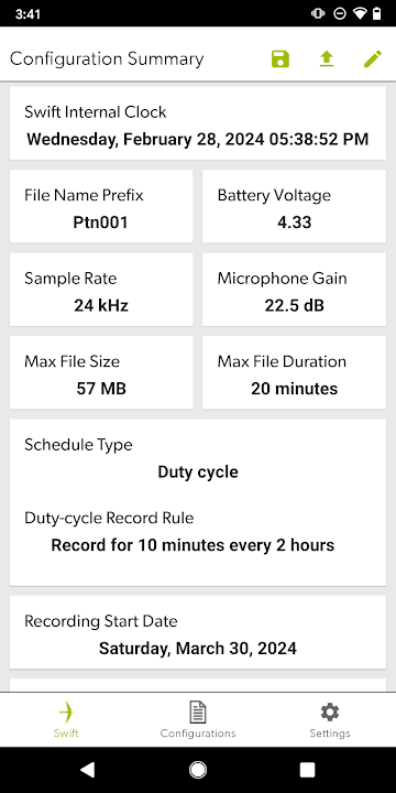 This configuration tool is used to configure recording settings and schedules when deploying a SwiftOne passive acoustic recorder.