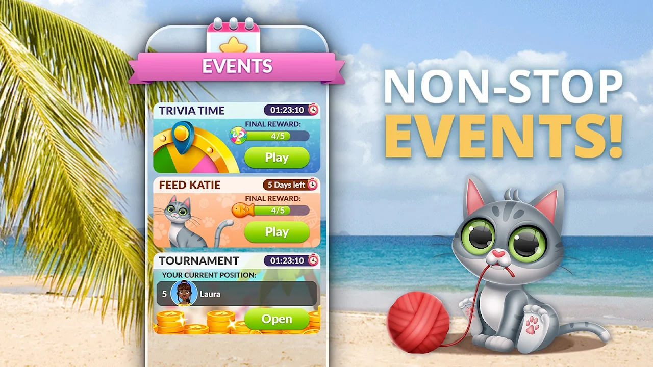 • Events galore: Feed word cookies to Katie the cat, challenge yourself with Trivia and, enjoy Tournaments!