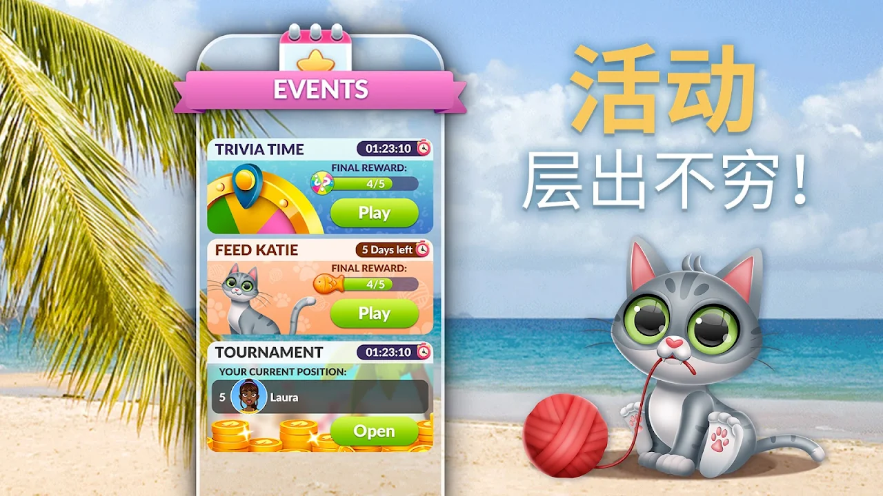 •玩法丰富:给小猫凯蒂喂食文字饼干,挑战自己的冷知识水平,还可以参加锦标赛!