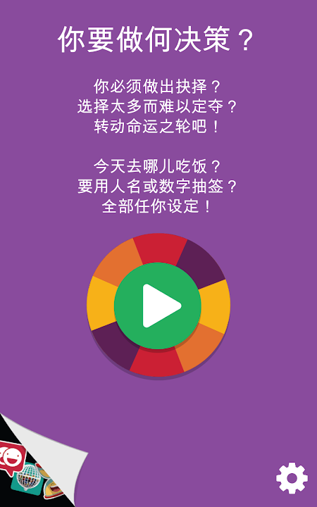 本应用免费,且简单好用。你可以用它来决定“吃什么”、“抽签”、“真心话大冒险”、“转瓶子”、……反正你说了算!你只需填好选项并转动轮盘!