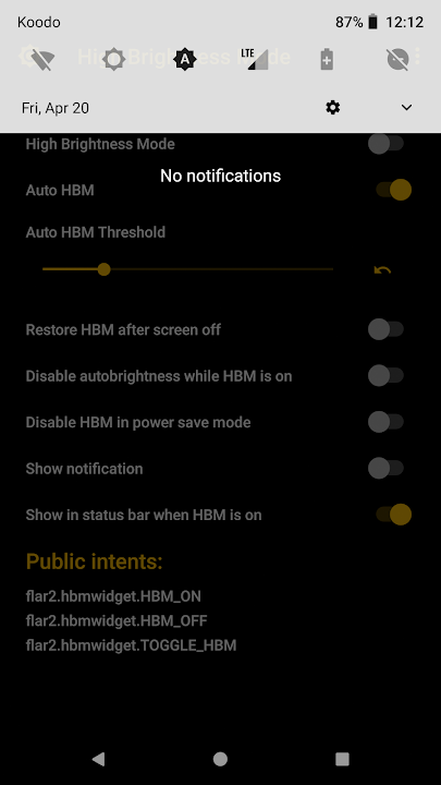 Auto mode will automatically turn high brightness mode on or off depending on the brightness (ambient light) of your surroundings. You can adjust the threshold for triggering high brightness mode and set auto mode using either the app, widget or quick settings tile.