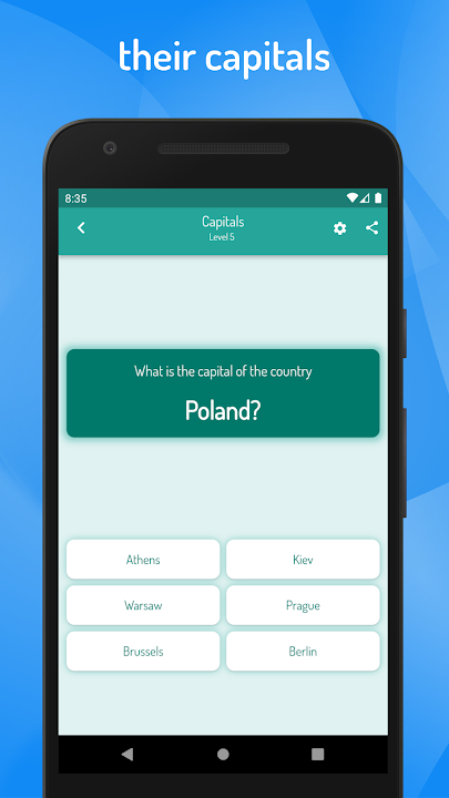 In this geographic game, you will learn to know the names, flags, cities and capitals of all the world countries as well as know how to identify them on the map of the world.