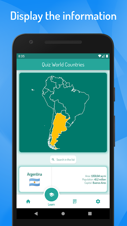 To get to know the world countries, simply select the learning mode and click on the map of the world to view the details of the selected country, including the country capital, its flag, area of the country and its population.