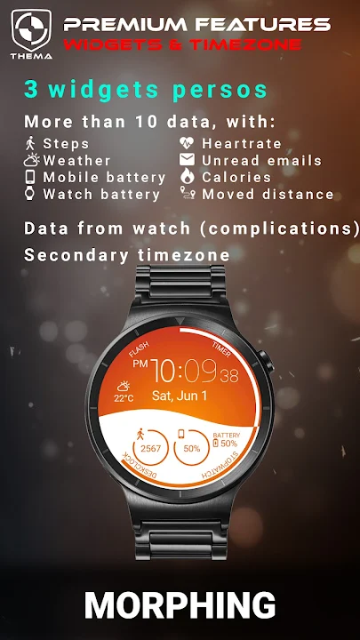 + Choose between up to 8 indicators (Daily step count, Heartbeat frequency, Unread Email from Gmail, etc...)