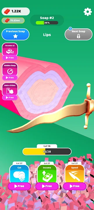 - 点击切片:逐层切割色彩鲜艳的肥皂。每次切割都会展现出迷人的图案并解锁新的设计。