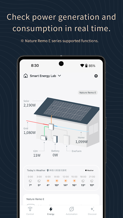 The Nature Home app is an app that connects with both the smart remote control, Nature Remo, and smartphone HEMS, Nature Remo E, each part of their respective series. With this app, you can seamlessly control infrared appliances and energy management devices throughout your room.