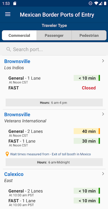 The CBP Border Wait Times app provides wait times/lane status for US entry ports