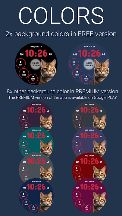 您可以透過開啟手機應用程式或點擊錶盤上的「UNLOCK Premium」按鈕輕鬆存取它,然後您將被重新導向到 Google Play 商店中的 CuteCat Premium WF。