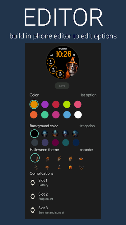 万圣节 2024 表盘完全兼容 Wear OS 3、Wear OS 4 和 Wear OS 5,并采用表盘格式技术