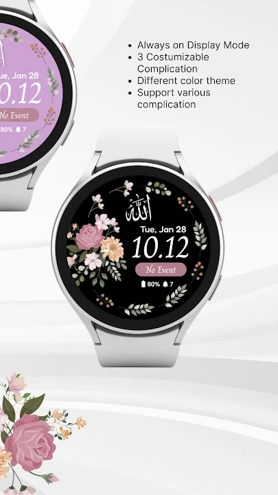 Islamic Digital Watch Face is an Islamic and Muslimah themed Watch Face with different color background choices, also supports shortcuts for 3 complications.