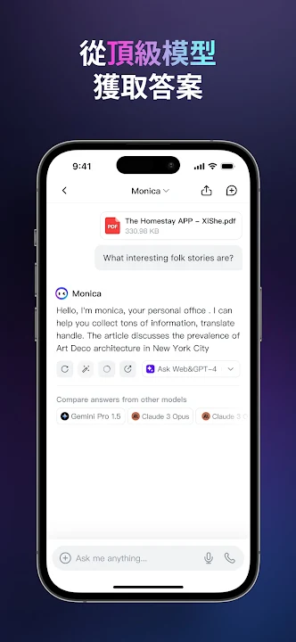 - 與檔案聊天:上傳PDF或圖像直接提問。
