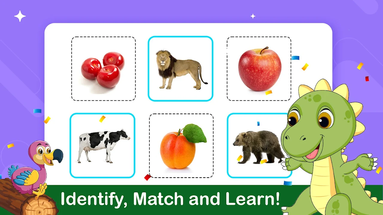 Vocabulary Valley – categories like animals, food, emotions, vehicles.